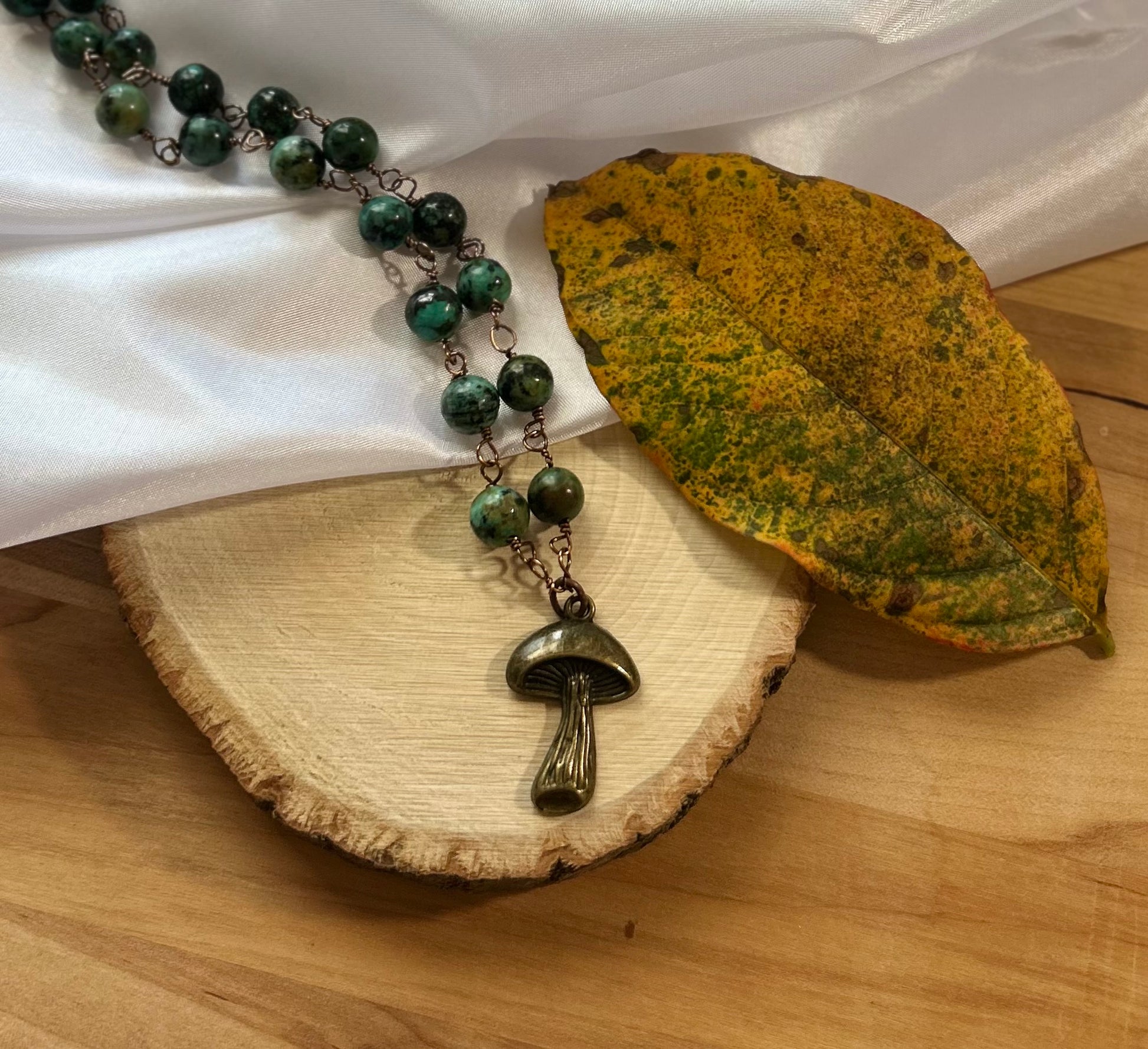 Chrysocolla Beaded Necklace With Bronze Mushroom Charm