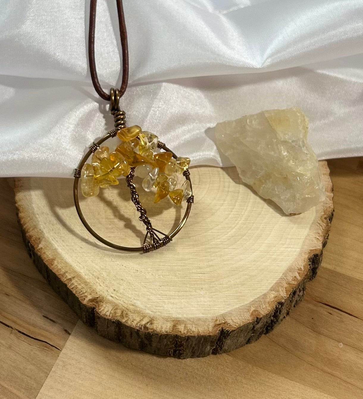 Citrine Tree of Life Necklace - Bronze Wire on Brown Leather Cord