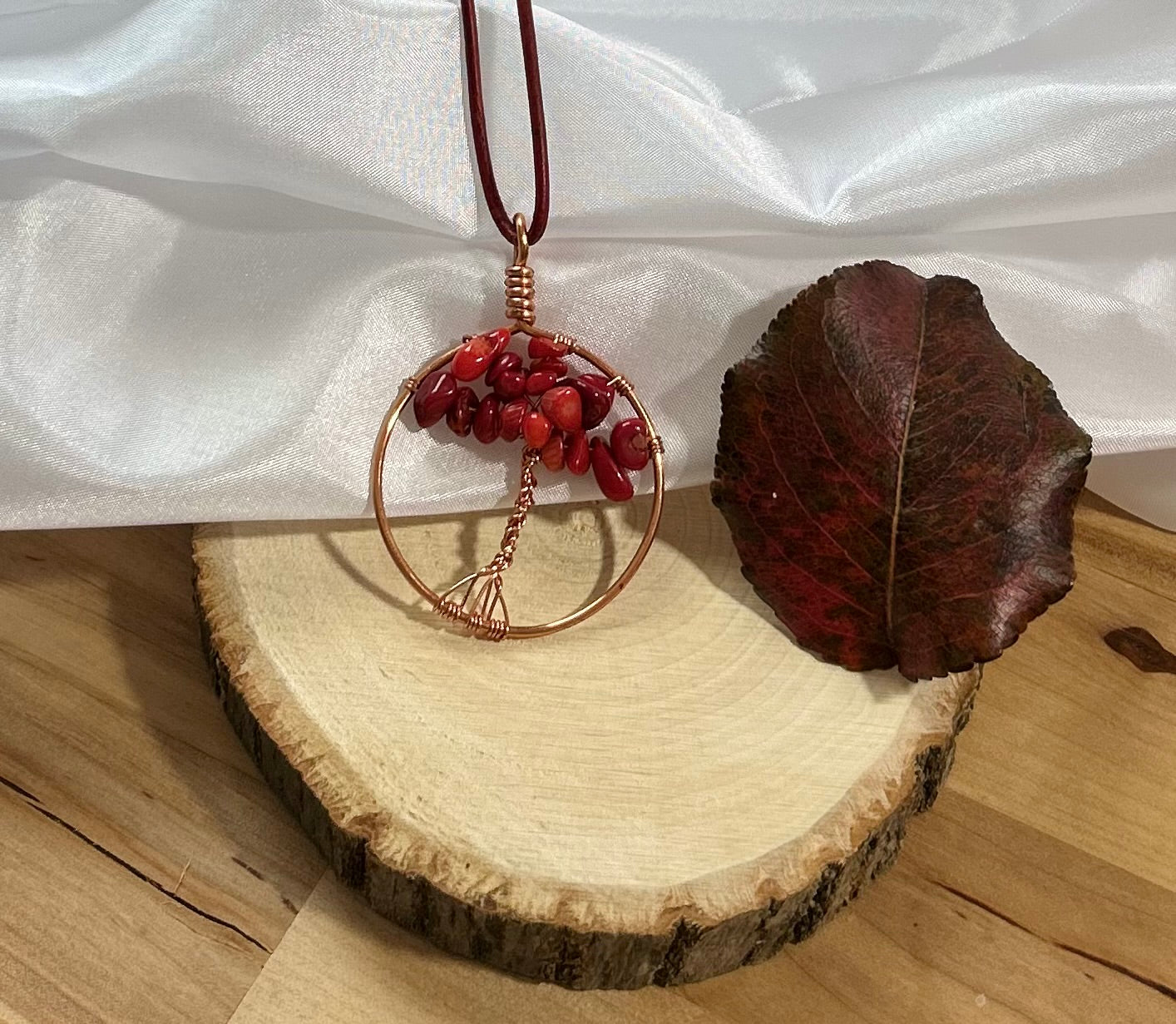 This handmade Tree of Life Necklace embodies the connection between earth and spirit. The pendant is carefully wire-wrapped with bronze wire and adorned with red jasper stones, known for its stabilizing and protective energy.